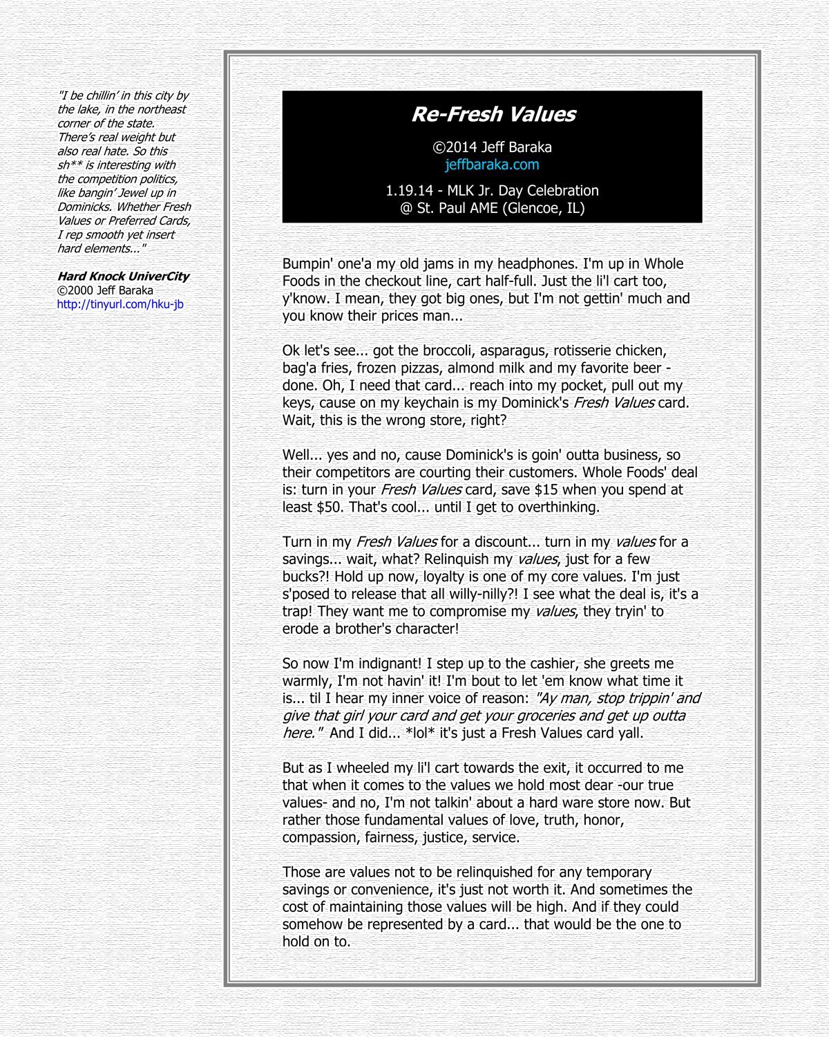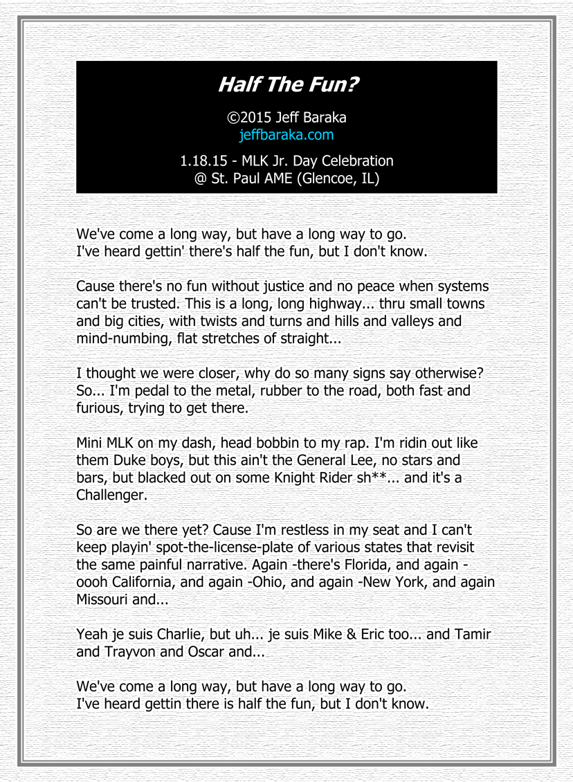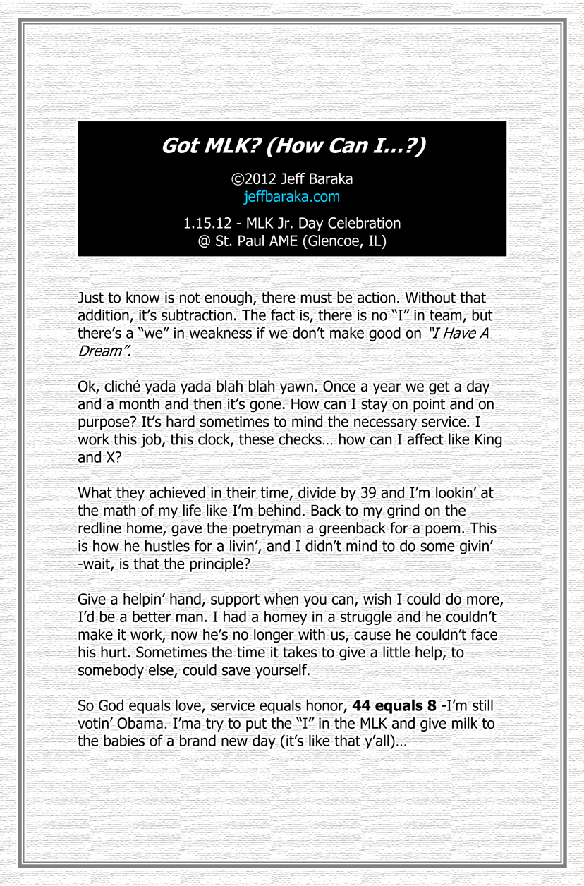 Since 2008, I’ve participated in the annual MLK Day Celebration at St. Paul AME Glencoe. I usually write and deliver a new poem for the specific theme of the given year’s presentation (as conveyed to me by event coordinator, Susan Richmond). This activity coincided with Barack Obama’s historical presidency (44=8 Forty-Four Equals Eight) and I’ve often invoked him in some way for his obvious representation of Dr. King’s vision. Here are direct links to my poems for the years I’ve participated: 2017, 2015, 2014, 2013, 2012, 2010, 2009, 2008.