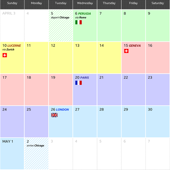 April 2022, I embarked on a month-long, 5-city Euro Grand Tour for my various, independent media and arts ventures. I started with flights to Rome —for the yearly International Journalism Festival in Perugia— and Zurich, to refresh my Cultural Ambassador activity in Lucerne; then direct train travel to Geneva, Paris and London (including the Eurostar through the “chunnel”).